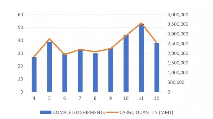 从图表可见,公司全年航次频率与运输量稳步增长,11月达到峰值,单月完成超过50个航次,运输量突破360万吨,展现出强大的执行力和市场响应能力。